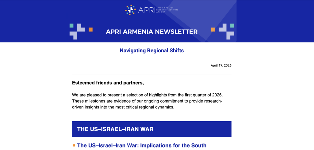 APRI Armenia Newsletters April 17, 2026 Newsletter: Navigating Regional Shifts Sign up to receive APRI Armenia newsletters First Name *Last Name *Email Address *CountryAfghanistanAlbaniaAlgeriaAmerican SamoaAndorraAngolaAnguillaAntarcticaAntigua and BarbudaArgentinaArmeniaArubaAustraliaAustriaAzerbaijanBahamasBahrainBangladeshBarbadosBelarusBelgiumBelizeBeninBermudaBhutanBoliviaBosnia and HerzegovinaBotswanaBouvet IslandBrazilBritish Indian Ocean TerritoryBruneiBulgariaBurkina FasoBurundiCabo VerdeCambodiaCameroonCanadaCayman IslandsCentral African RepublicChadChileChina, People's Republic ofChristmas IslandCocos IslandsColombiaComorosCongo, Democratic Republic of theCongo, Republic of theCook IslandsCosta RicaCroatiaCubaCuraçaoCyprusCzech RepublicCôte d'IvoireDenmarkDjiboutiDominicaDominican RepublicEast TimorEcuadorEgyptEl SalvadorEquatorial GuineaEritreaEstoniaEthiopiaFalkland IslandsFaroe IslandsFijiFinlandFranceFrance, MetropolitanFrench GuianaFrench PolynesiaFrench South TerritoriesGabonGambiaGeorgiaGermanyGhanaGibraltarGreeceGreenlandGrenadaGuadeloupeGuamGuatemalaGuernseyGuineaGuinea-BissauGuyanaHaitiHeard Island And Mcdonald IslandHondurasHong KongHungaryIcelandIndiaIndonesiaIranIraqIrelandIsraelItalyJamaicaJapanJerseyJohnston IslandJordanKazakhstanKenyaKiribatiKorea, Democratic People's Republic ofKorea, Republic ofKosovoKuwaitKyrgyzstanLao People's Democratic RepublicLatviaLebanonLesothoLiberiaLibyaLiechtensteinLithuaniaLuxembourgMacauMadagascarMalawiMalaysiaMaldivesMaliMaltaMarshall IslandsMartiniqueMauritaniaMauritiusMayotteMexicoMicronesiaMoldovaMonacoMongoliaMontenegroMontserratMoroccoMozambiqueMyanmarNamibiaNauruNepalNetherlandsNetherlands AntillesNew CaledoniaNew ZealandNicaraguaNigerNigeriaNiueNorfolk IslandNorth MacedoniaNorthern Mariana IslandsNorwayOmanPakistanPalauPalestine, State ofPanamaPapua New GuineaParaguayPeruPhilippinesPitcairn IslandsPolandPortugalPuerto RicoQatarReunion IslandRomaniaRussiaRwandaSaint HelenaSaint Kitts and NevisSaint LuciaSaint Pierre & MiquelonSaint Vincent and the GrenadinesSamoaSan MarinoSao Tome and PrincipeSaudi ArabiaSenegalSerbiaSeychellesSierra LeoneSingaporeSint MaartenSlovakiaSloveniaSolomon IslandsSomaliaSouth AfricaSouth Georgia and South SandwichSpainSri LankaStateless PersonsSudanSudan, SouthSurinameSvalbard and Jan MayenSwazilandSwedenSwitzerlandSyriaTaiwan, Republic of ChinaTajikistanTanzaniaThailandTogoTokelauTongaTrinidad and TobagoTunisiaTurkeyTurkmenistanTurks And Caicos IslandsTuvaluUS Minor Outlying IslandsUgandaUkraineUnited Arab EmiratesUnited KingdomUnited States of America (USA)UruguayUzbekistanVanuatuVatican CityVenezuelaVietnamVirgin Islands, BritishVirgin Islands, U.S.Wallis And Futuna IslandsWestern SaharaYemenZambiaZimbabweOrganization *Job title * Sign Up